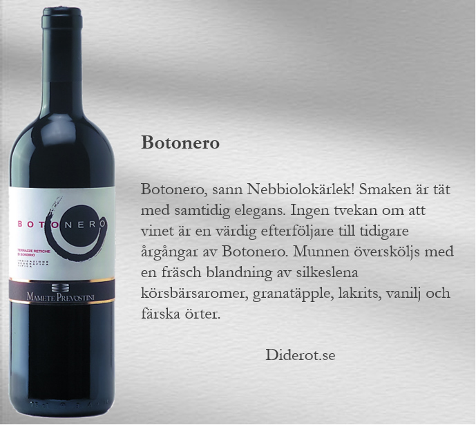 "Botonero - Sann Nebbiolokärlek! Valtellinaproducenten Mamete Prevostini hanterar den kära Nebbiolodruvan på ett helt unik sätt. Ofta är deras viner fyllda av karaktär i kombination med en silkeslen kropp. Deras något rockigare Botonero har fallit mig helt i smaken.